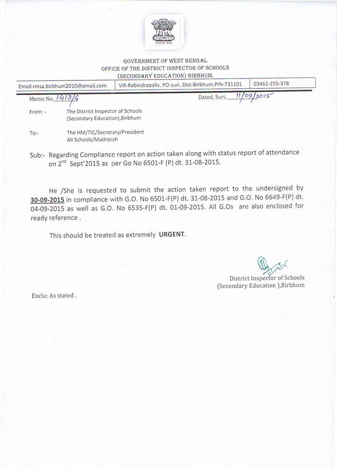 Birbhum DI seeking report of attendance on 2nd Sep 2015